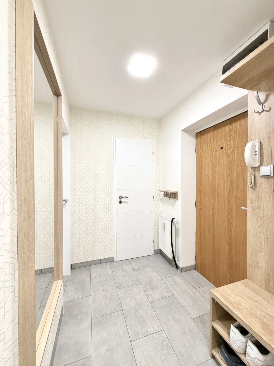 Byt se nabízí částečně vybavený. Kuchyně disponuje myčkou, elektrickou troubou, varnou deskou a digestoří. Obývací část je zařízena pohovkou, konferenčním stolem, křeslem a knihovnou. Ložnice je bez vybavení. V druhém pokoji najdeme pracovní stůl s židlí, šatní skříň, dvě postele a noční stolky. V koupelně je vana, umyvadlo a topný žebříček. Toaleta je umístěna samostatně.