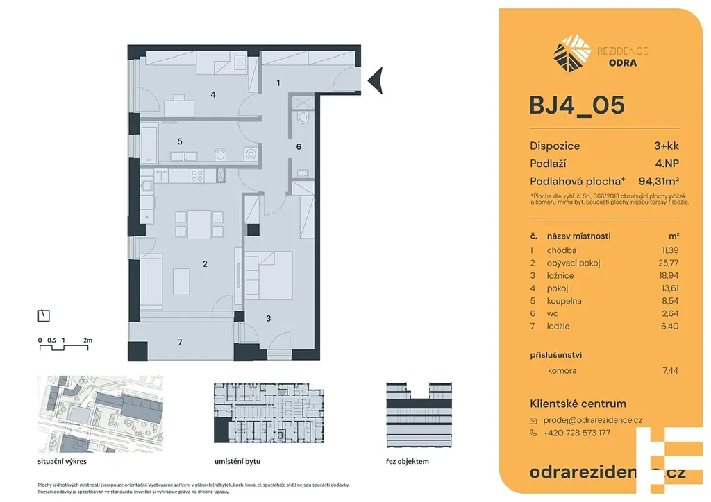 Hledáte nový domov v klidné a přitom skvěle dostupné lokalitě? Rezidence Odra je moderní projekt s duší i budoucností, který vzniká na místě bývalého obchodního centra v pražských Bohnicích. Nyní vám nabízíme konkrétní volnou jednotku 3+kk o ploše 94,31  m², nacházející se ve 4. nadzemním podlaží budovy ve fázi dokončení.
