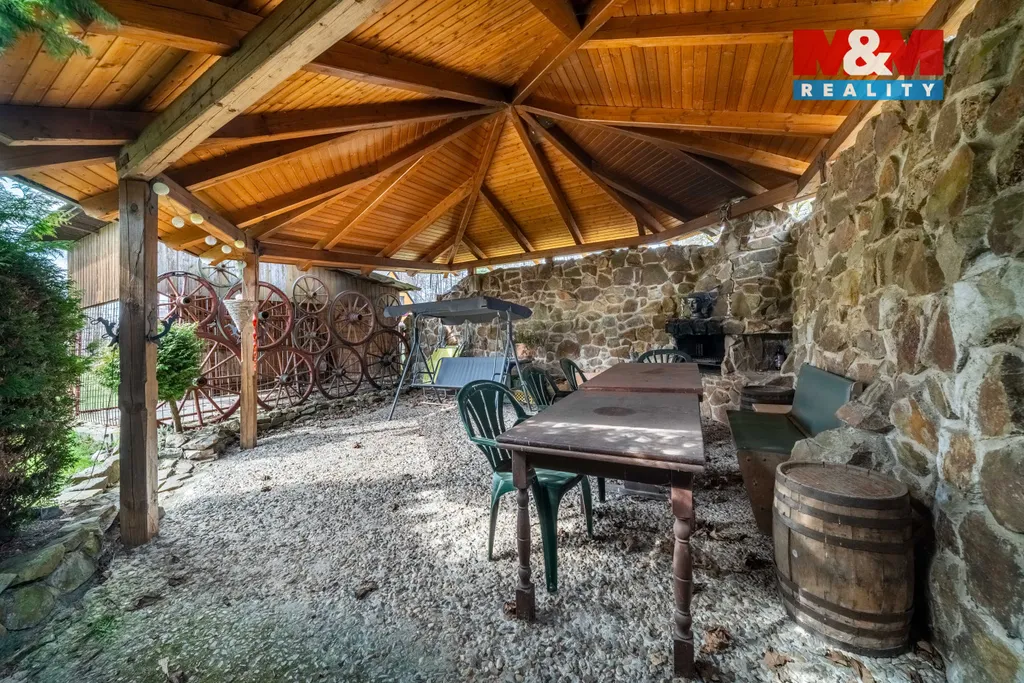 Součástí nemovitosti je také prostorná zahrada o výměře 662 m², na které se nachází pergola s krbem, ideální pro relaxaci a posezení. Dům je kompletně podsklepený, přičemž součástí suterénu je také garáž.