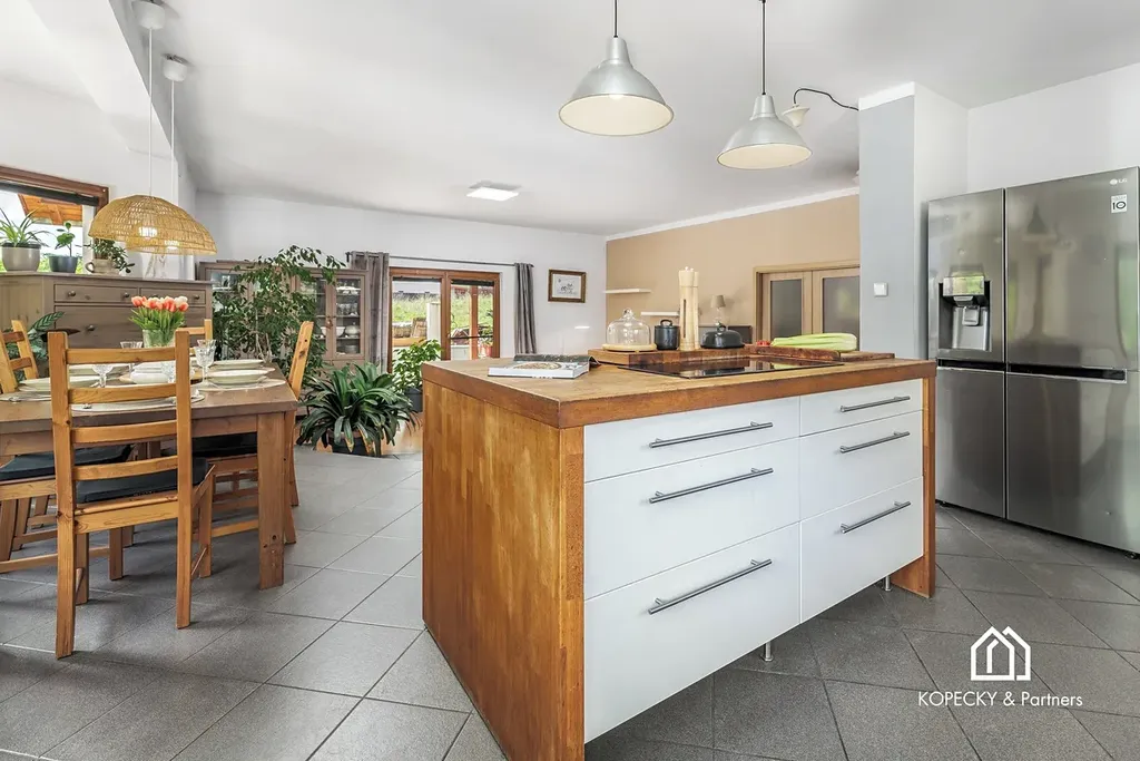 V přízemí domu se nachází prostorný a světlý obývací pokoj, propojený s moderně zařízenou kuchyní, vybavenou kvalitními spotřebiči. Přímo z obývacího pokoje můžete vstoupit na terasu, která je ideálním místem pro odpočinek, rodinná setkání nebo grilování. Dále je zde samostatná pracovna, praktická koupelna se sprchovým koutem, technická místnost a prostorná garáž pro dvě auta s dílnou.