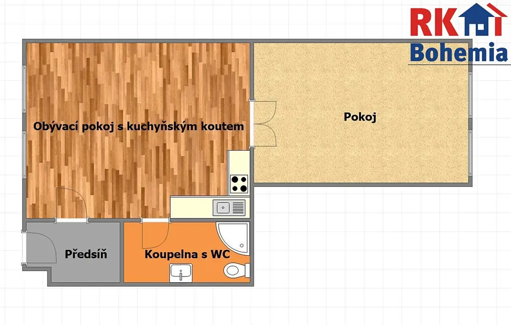 Nachází se zde obývací pokoj s kuchyňským koutem, ložnice, předsíň a koupelna s umyvadlem, sprchovým koutem a s WC.