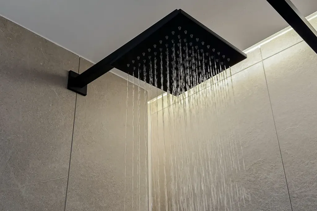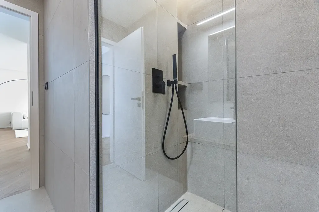 Koupelna je řešena ve vysokém standardu, s důrazem na detail a komfort – dominuje jí nadstandardně velký sprchový kout.