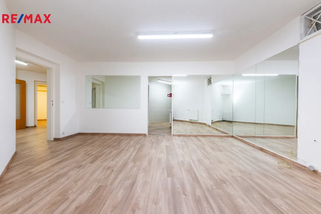 V patře se nachází několik samostatných místností využitelných jako kanceláře nebo konzultační místnosti, doplněné koupelnami a sociálním zázemím. Na dvě místnosti navíc navazují šatny, které lze využít jako archiv či příruční sklad. Výhodou objektu je tak i možnost krátkodobého ubytování zaměstnanců či firemních návštěv. Prostory jsou vybaveny klimatizačními jednotkami.