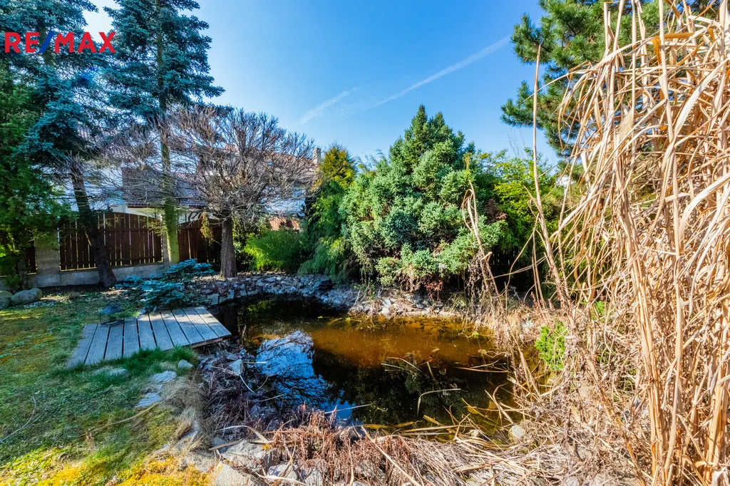 Součástí vzrostlé zahrady je okrasné jezírko, venkovní posezení s krbem a vířivka. Údržbu zajišťuje robotická sekačka a zavlažovací systém.