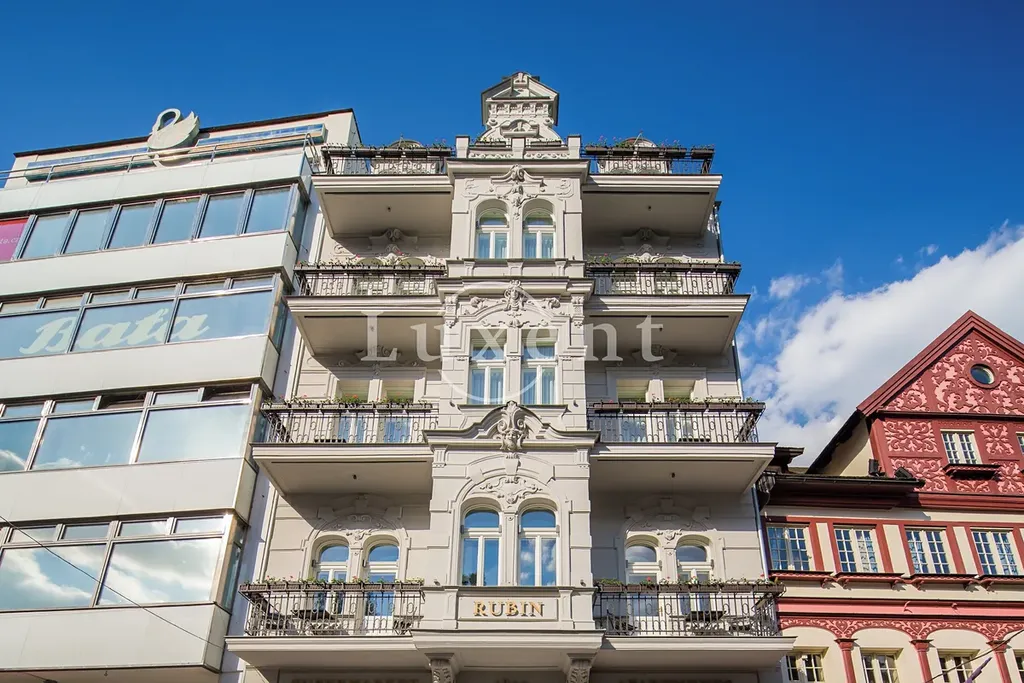 Byty jsou designové, prémiově zařízené italským nábytkem včetně kuchyně, osvětlení i nábytku. Mají své balkony s výhledem na kolonádu nebo klidné terasy s orientací do klidného stylového dvora. Dva z horních bytů jsou mezonetového typu. Z jednoho z bytů ve 2.NP je momentálně velmi příjemné SPA se saunami, odpočívárnou a terasou k užití pro uživatele bytů. V přízemí je úspěšně provozována restaurace. V suterénu je pak technické zázemí. Dům byl postaven v r. 1897 podle karlovarského architekta Karla Hellera. Jako památkově chráněný byl v r. 2016 kompletně zrekonstruován podle italského inženýra Stefana Stramigioli a dokončen architekty ateliéru Soukup.