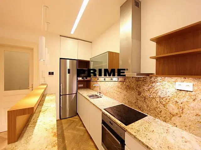 Zrekonstruovaný, světlý, 2 ložnicový, nezařízený byt se 2 koupelnami k pronájmu, 3+kk, 94m2, s parkovacím stáním pro jedno auto ve dvoře a se sklepem. Byt je situovaný v 5. patře zrenovovaného secesního bytového domu s výtahem.