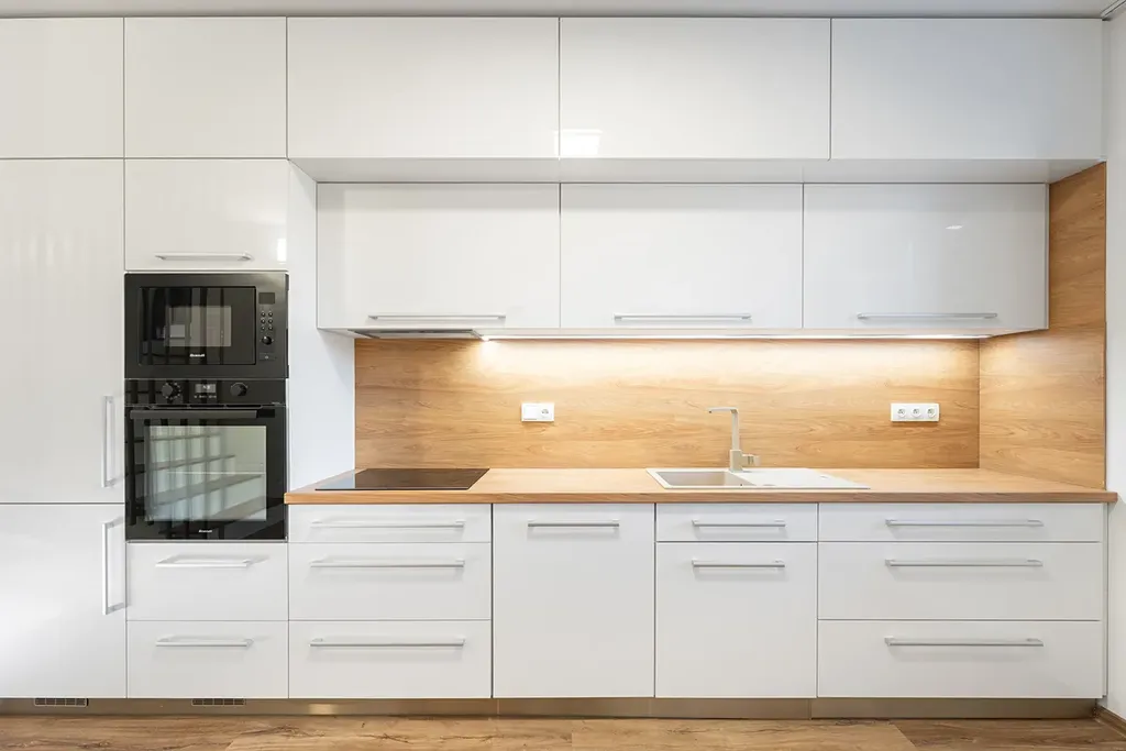 Elektro: TV zásuvka, internet zásuvka, spínače ventilátorů, vývody osvětlení, vývod pro varnou desku, troubu a digestoř, zásuvky, vypínače, příprava pro zabezpečovací zařízení