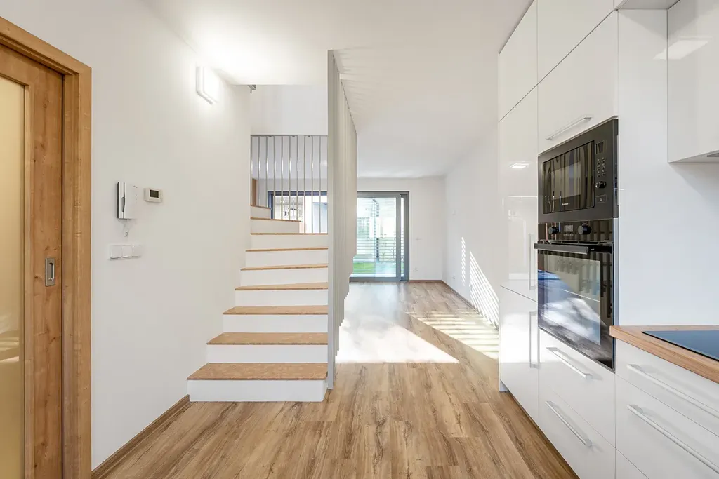 Dispoziční řešení domu bylo promyšlené do posledních detailů a ani na kvalitě použitých materiálů se rozhodně nešetřilo, nejen mramorové schodiště či hliníkové portálové dveře, předokenní žaluzie ve všech oknech a dveřích, moderně řešené koupelny v obou patrech, vinylové podlahy či interiérové obložkové dveře, příprava na klimatizaci či zabezpečovací systém a v neposlední řadě i moderní kuchyňská linka včetně spotřebičů řešená na míru, jsou toho důkazem.