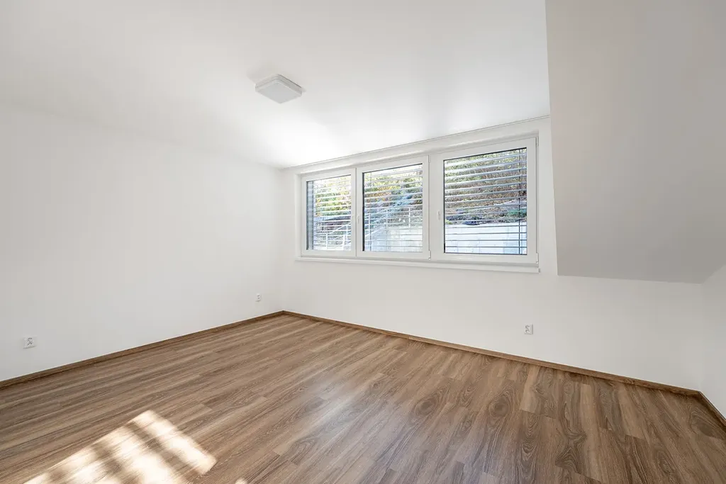 V přízemí se tedy nachází zádveří, chodba s vestavěnými skříněmi, samostatná toaleta pro spodní patro, kuchyně s moderní kuchyňskou linkou řešenou na míru propojena s obývacím pokojem, který je jednak pěkně prosvětlen velkými posuvnými hliníkovými dveřmi skrz, které lze vstoupit na dvorek a zahrádku, za kterou se nachází další obytný prostor s širokým spektrem využití dle vašich představ.