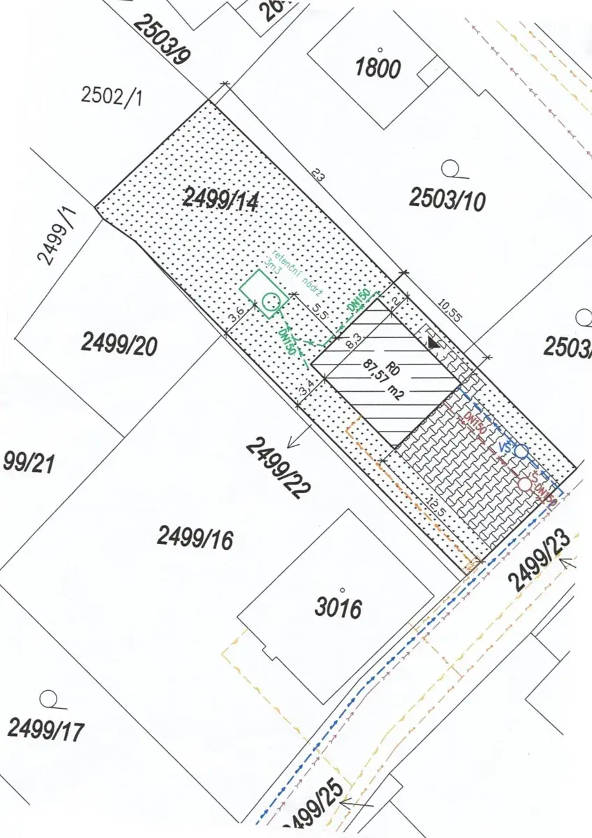Na hranici pozemku se nachází elektřina, voda i kanalizace.