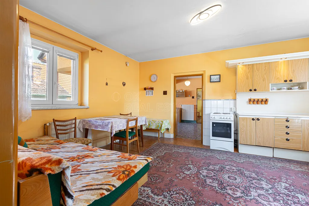 Interiér domu se skládá ze tří pokojů, které lze přizpůsobit dle vašich představ a potřeb. Dům je v dobrém stavu a již nyní nabízí částečné vybavení pro pohodlné bydlení. K dispozici je obrovský úložný prostor v podkroví, v podobě prostorné půdy, a také sklep o ploše cca 25 m², ideální pro uskladnění věcí. Součástí nemovitosti je i garáž, vhodná pro dílnu, která navíc disponuje servisním kanálem pro pohodlnou údržbu podvozku vašeho automobilu a stodola pro uschování zahradní techniky.