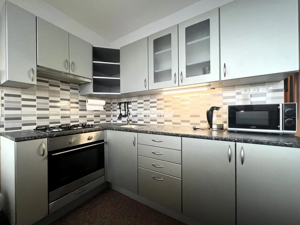 Byt se skládá ze zařízené kuchyně, vč. vestavěných spotřebičů, mikrovlnné trouby a jídelního koutu, dále zařízeného obývacího pokoje, (sedací souprava, obývací stěna a drobný nábytek. Dále ložnice se skříňkou a postelí a koupelna se sprchovým koutem, WC a funkční pračkou. V bytě je prostorná komora s velmi velkorysým úložným prostorem a řada dalšího drobného nábytku, viz foto, k dispozici také sklepní kóje.