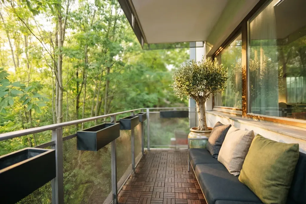 !!! Maximální soukromí s výhledem do lesa (8 m² balkon): Zatímco vstup je v úrovni terénu, díky kaskádě se obývací pokoj nachází ve výšce 2. NP. Balkon směřuje přímo do vzrostlého lesoparku – absolutní ticho, zeleň a soukromí bez sousedů naproti.