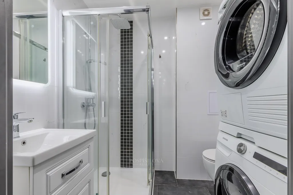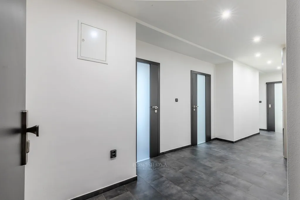 Interiér je řešen v moderním a nadčasovém stylu. Po vstupu do bytu se ocitnete v prostorné předsíni, z které se vchází do ostatních prostor. Kuchyň se nachází proti vstupním dveřím a je vybavena moderní kuchyňskou linkou v šedém provedení, samozřejmostí jsou vestavěné spotřebiče. Z kuchyně se vstupuje do obývacího pokoje, vstup je možný i z předsíně. Obývací pokoj nabízí dostatek prostoru pro sedací soupravu, obývací stěnu i jídelní stůl. V zadní části bytu je ložnice, do které se pohodlně vejde velká postel i další vybaveni podle potřeb nového majitele. Koupelna je prostorná, se sprchovým koutem a místem pro pračku a sušičku. Toaleta je součástí koupelny. Celý byt je vybaven dveřmi značky Sapeli a moderními žaluziemi. V ložnici a obývacím pokoji jsou vinylové podlahy, v ostatních prostorách je dlažba. Orientace bytu je na východ. K bytu náleží prostorná sklepní kóje, vhodná pro sportovní vybavení a sezónní věci.