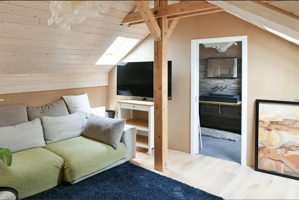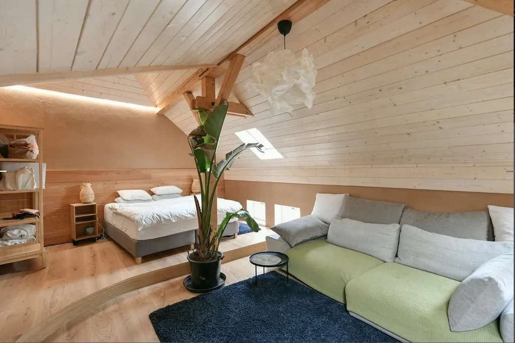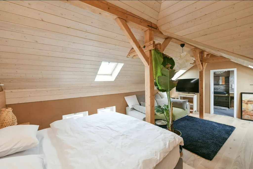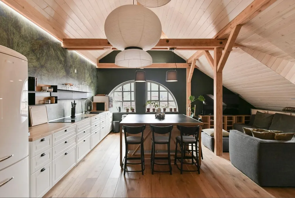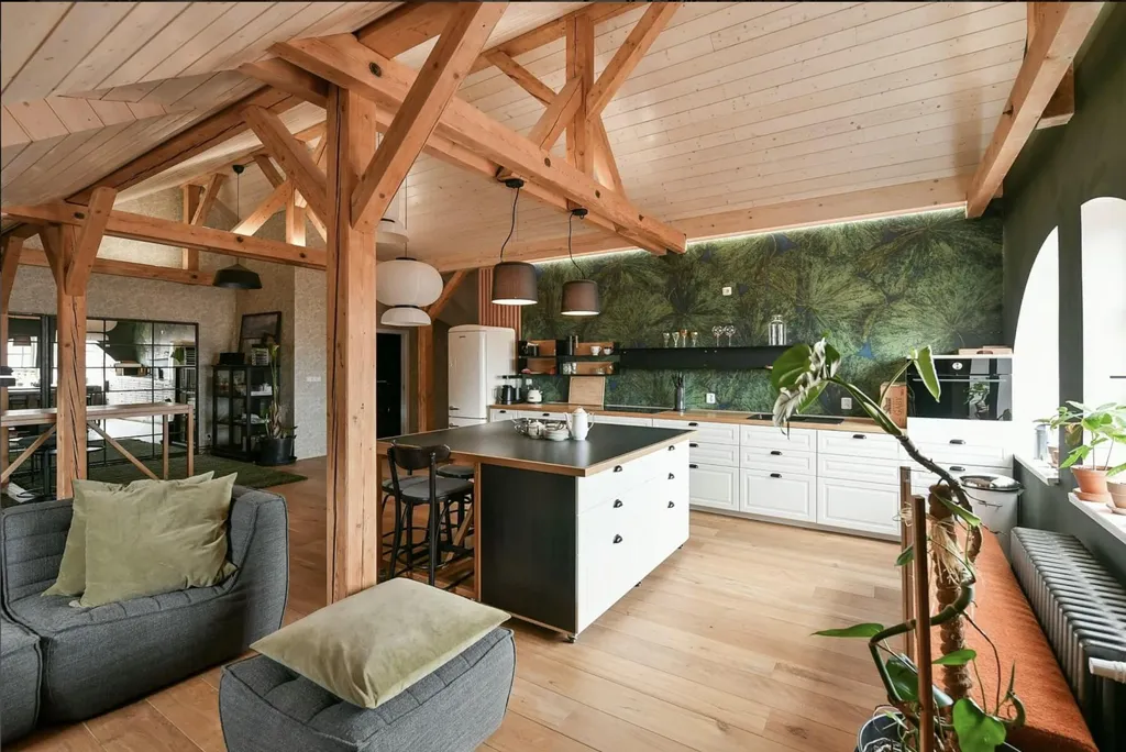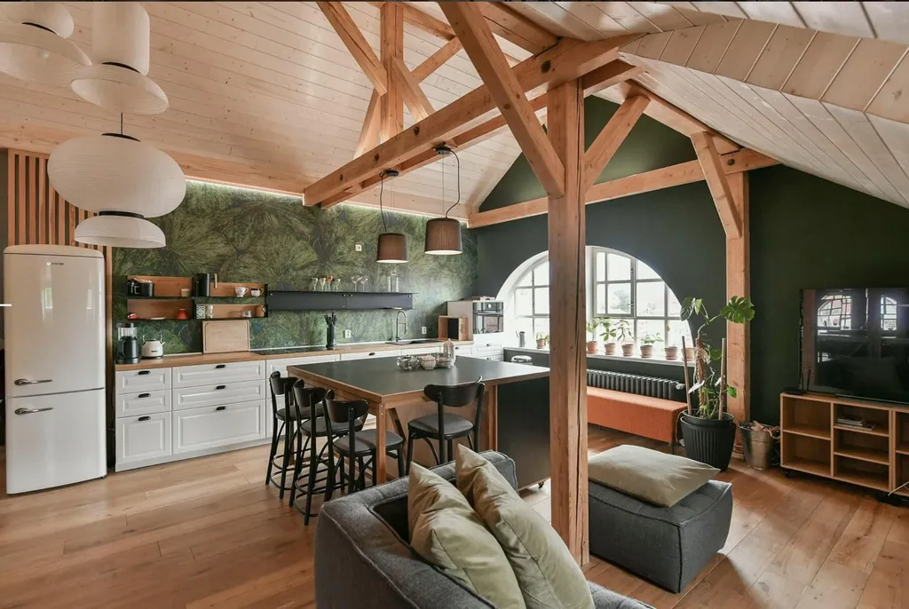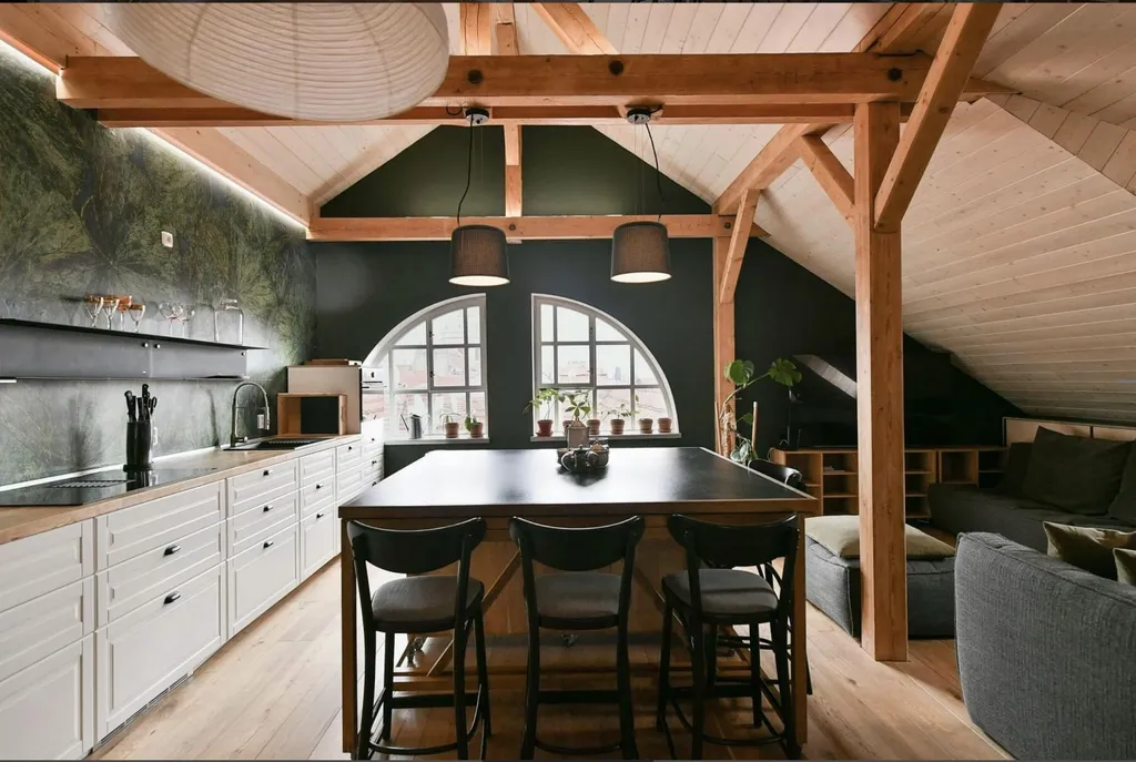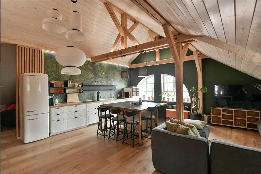 Dominantou bytu je velkorysý obytný prostor o velikosti 65 m and sup2;, který propojuje obývací část, kuchyňský kout a pracovní/klidovou zónu. Díky otevřenému prostoru, dřevěným trámům a podkrovnímu charakteru je prostor velmi vzdušný a působí jako moderní loft.