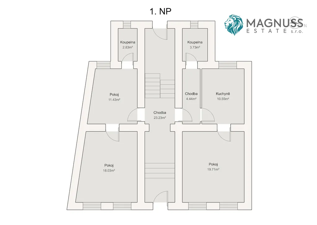 V prvním nadzemním podlaží, o celkové ploše cca 95 m², se nachází dvě jednotky 1+1, každá o velikosti přibližně 39 m². Obě mají vlastní vstupní chodbu a sociální zázemí a čekají na rekonstrukci podle představ nového majitele. Ve druhém nadzemním podlaží se pak nachází prostorný byt 3+1 o velikosti cca 80 m², který prošel částečnou rekonstrukcí. Toto patro vzniklo spojením dvou původních jednotek 1+1, a tak lze dispozici opět upravit na dvě samostatné jednotky o stejné podlahové ploše jako v prvním nadzemním podlaží.