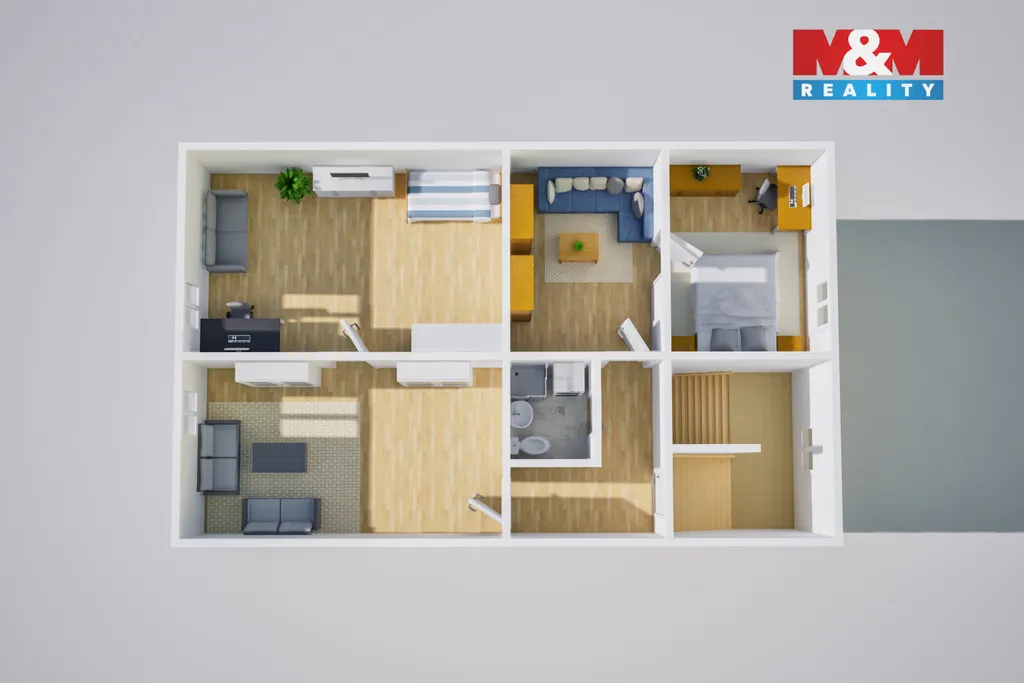 V prvním poschodí je byt o dispozici 2+1 s další místností bez okna sloužící jako šatna a koupelna a WC.