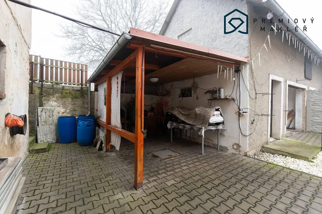 Před domem se nachází dlážděný dvůr s pojezdovou bránou, další garáž, malá dílna a kryté posezení s venkovním grilem. Nad domem je příjemná zahrádka, ideální pro dětské hry, relaxaci nebo posezení na čerstvém vzduchu.