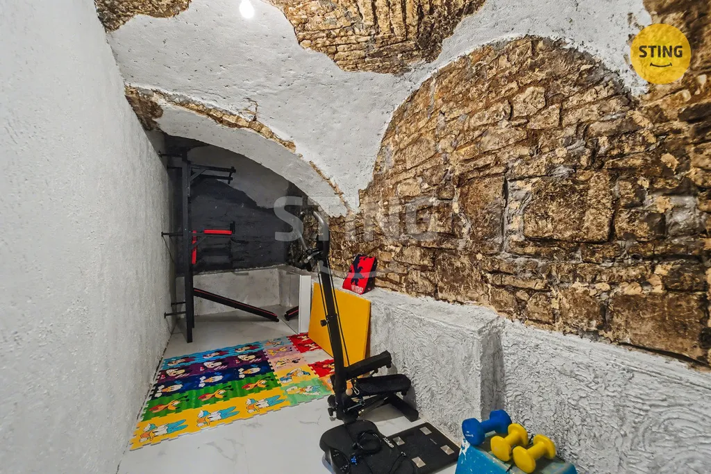 Přízemí: Velkorysý obývací pokoj s moderní kuchyňskou linkou (vestavná myčka, lednice), prostorná koupelna s WC a relaxační zóna.