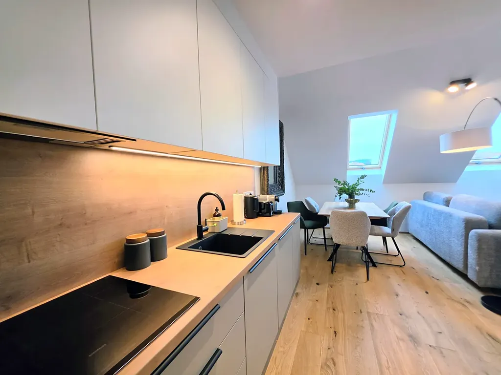 Součástí vybavení bude designová kuchyňská linka na míru s vestavěnými spotřebiči, doplněná pečlivě vybraným nábytkem, který podtrhuje moderní charakter interiéru. Byt bude dále vybaven pračkou a sušičkou, což zajišťuje plný komfort každodenního bydlení.