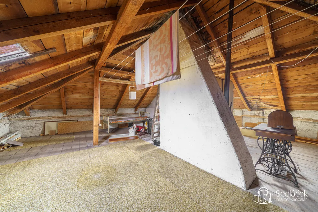 Nemovitost nabízí také prostornou půdu s možností vybudování půdní vestavby, čímž lze dále rozšířit obytnou plochu. Dům je kompletně podsklepený – sklepní prostory jsou suché, s dostatečnou světlou výškou, a nabízí tak široké využití, například pro relaxační zónu či saunu.