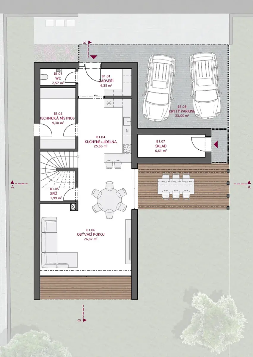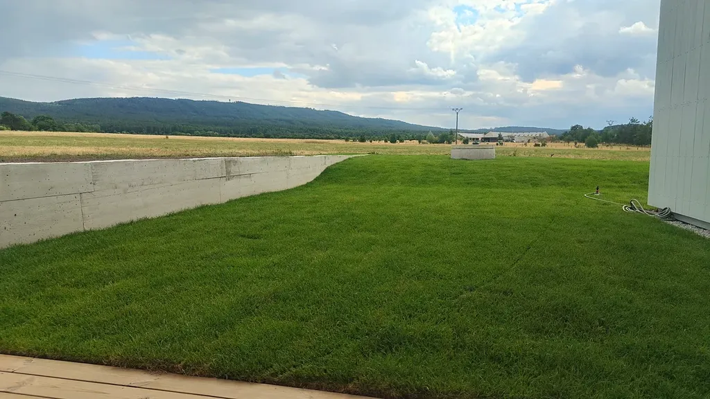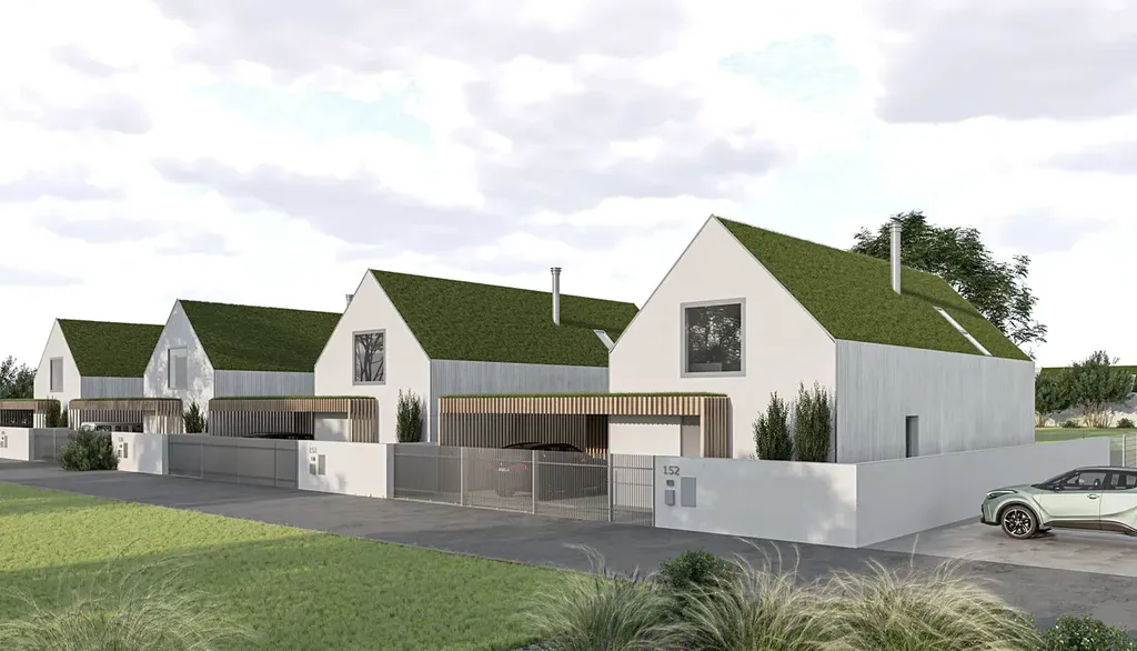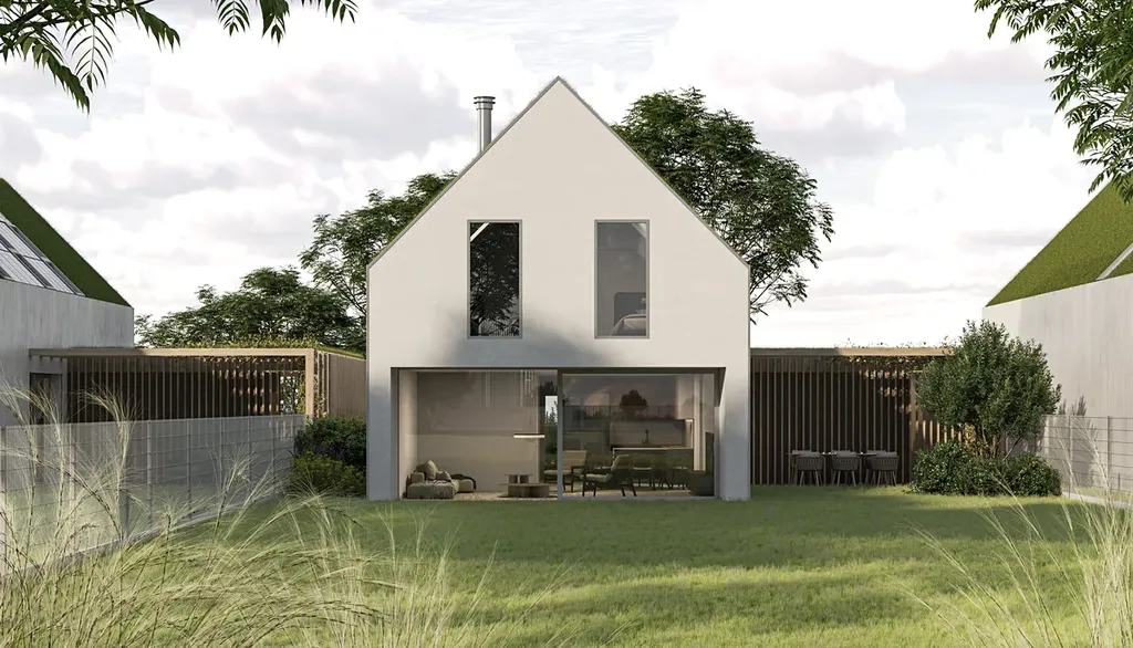Díky velkým proskleným plochám a posuvným portálům se dům přirozeně otevírá do zahrady, která plynule přechází do okolní přírody. Dvě prostorné terasy nabízejí ideální prostor pro relaxaci, grilování nebo ranní kávu s výhledem do zeleně. Součástí pozemku je i krytý přístřešek pro dvě auta s přípravou na nabíječku pro elektromobil a s integrovanou kolnou třeba na zahradní nářadí či zimní kola od aut.