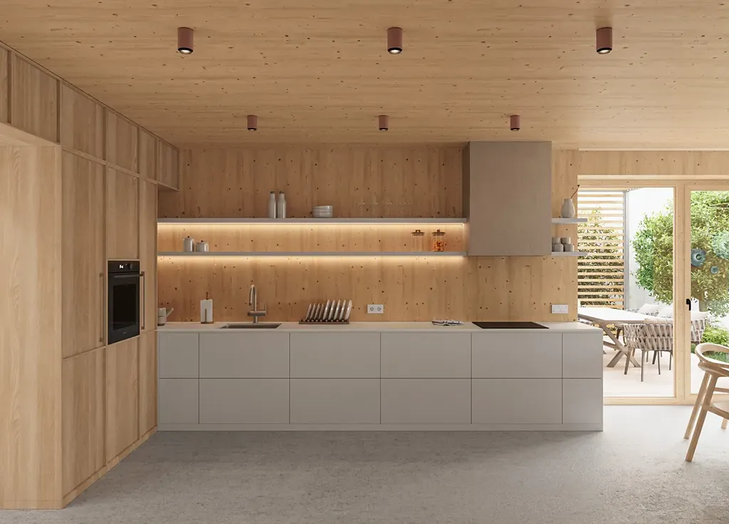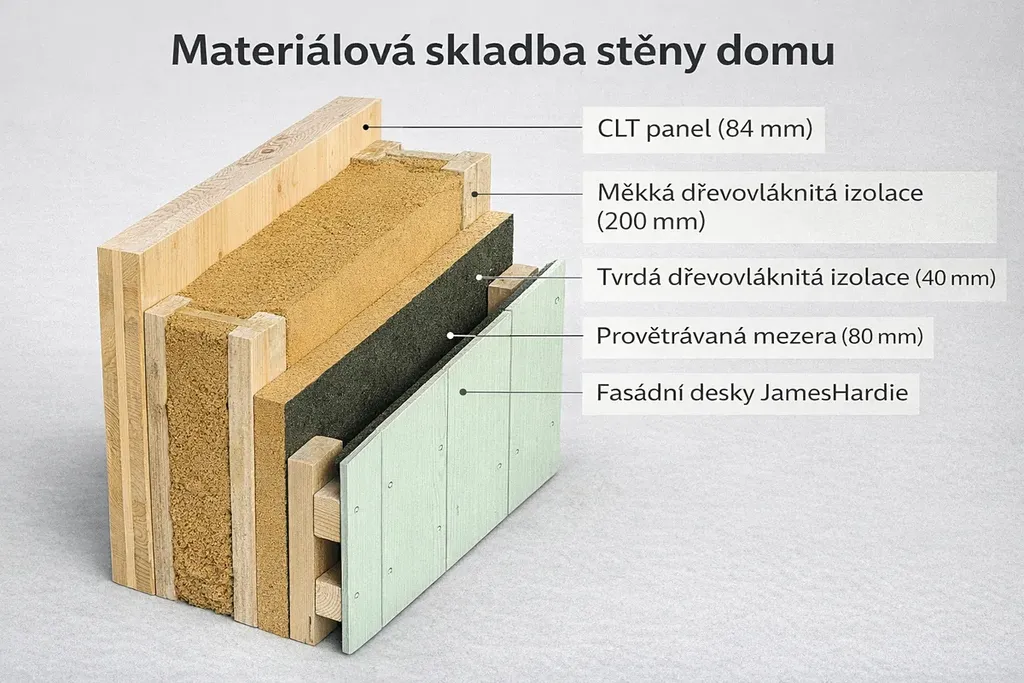 Tato dvoupodlažní dřevostavba je postavena z CLT panelů Novatop => žádné lehké duté OSB stěny, ale poctivé masivní dřevo. Fasáda a střecha jsou provětrávané, izolované přírodním dřevovláknem => žádný polystyren. Výsledkem je nízkoenergetický dům v energetické třídě A s velmi nízkými provozními náklady z udržitelných ekologických materiálů.