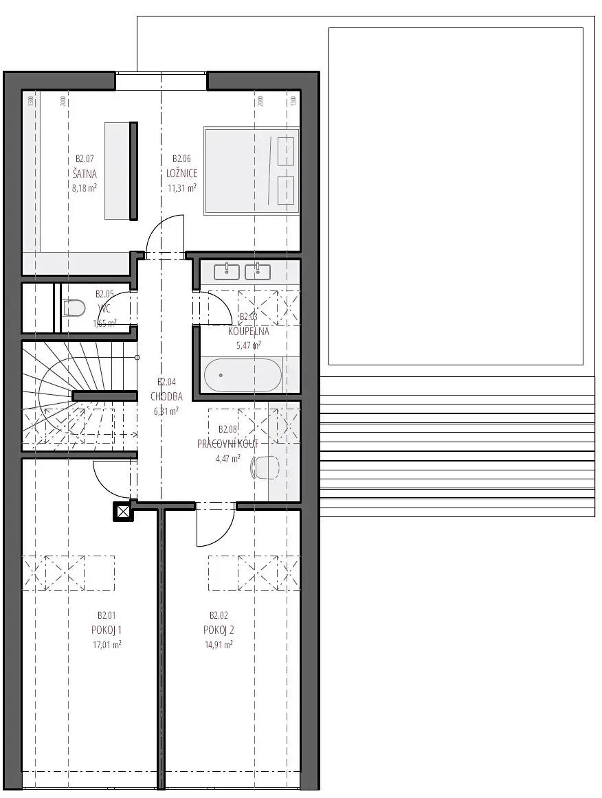 Dům je v podstatě k nastěhování – dokončený ve fázi Shell & Core, tedy plně funkční a připravený k individuálnímu dokončení interiéru dle vašich preferencí a stylu (finální podlahy, vnitřní dveře, koupelna, kuchyně…). My se ještě chystáme vysadit zelenou střechu.