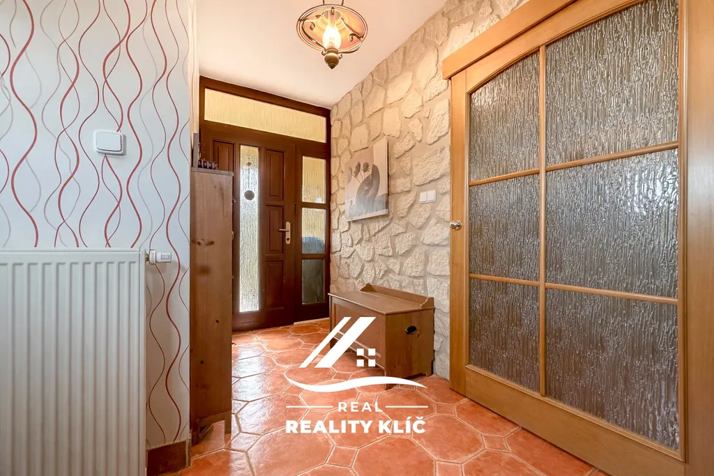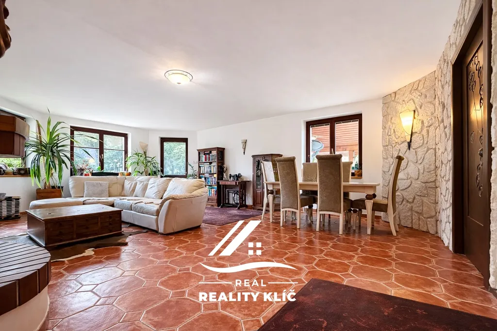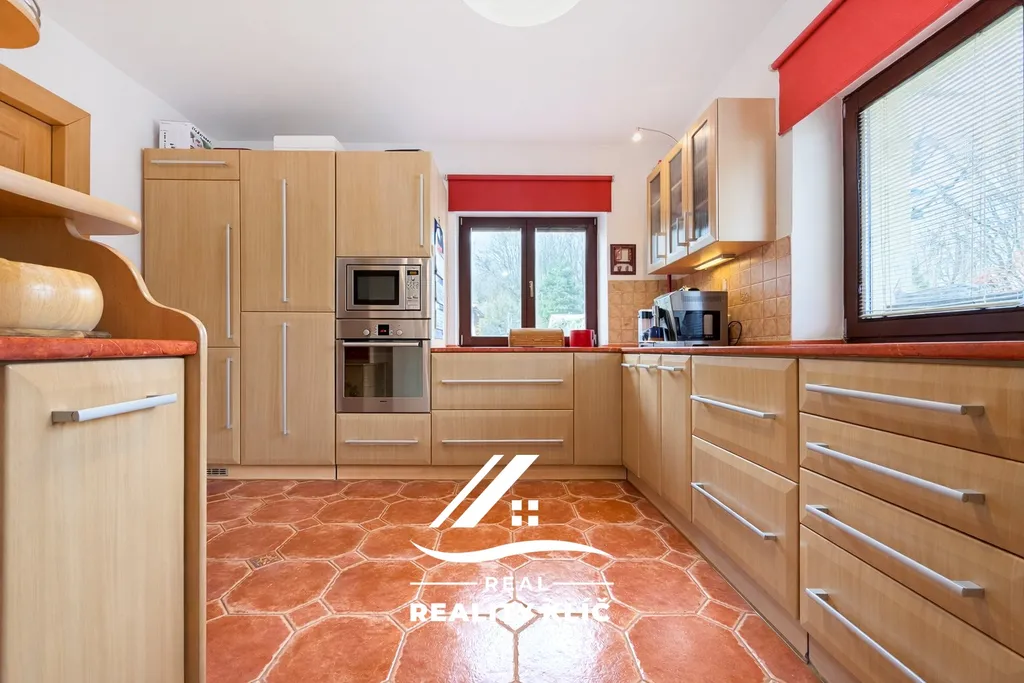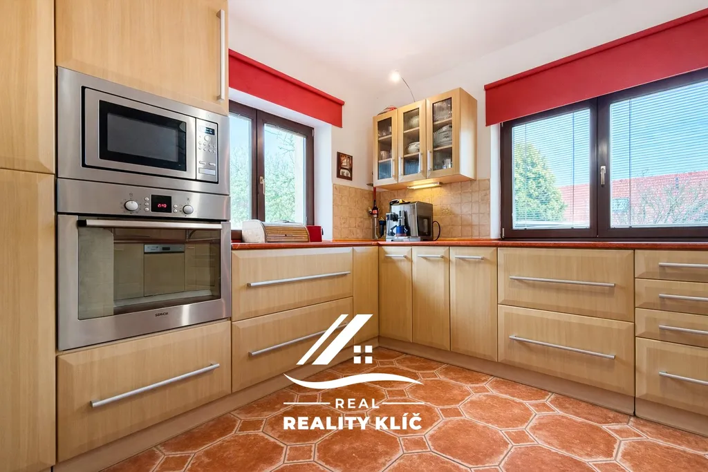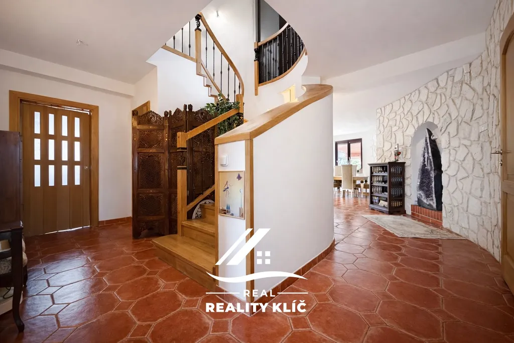 Samotný dům o zastavěné ploše 154 m² nabízí dvě podlaží s velmi promyšleným uspořádáním a nadstandardní výměrou obytných ploch. Hlavním centrem přízemí o celkové ploše 126 m² je velkorysý obývací pokoj o výměře 37 m² vybavený krbem, na který plynule navazuje kuchyně o ploše 17,1 m² s praktickou komorou. Z obývacího pokoje lze vstoupit přímo na rozlehlou, částečně zastřešenou terasu o rozloze 25 m², která přirozeně propojuje interiér se zahradou. Praktickou stránku přízemí doplňuje koupelna, pracovna a chodba umožňující komfortní vstup z garáže přímo do obytné části domu.