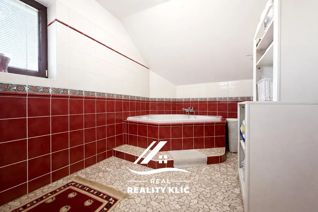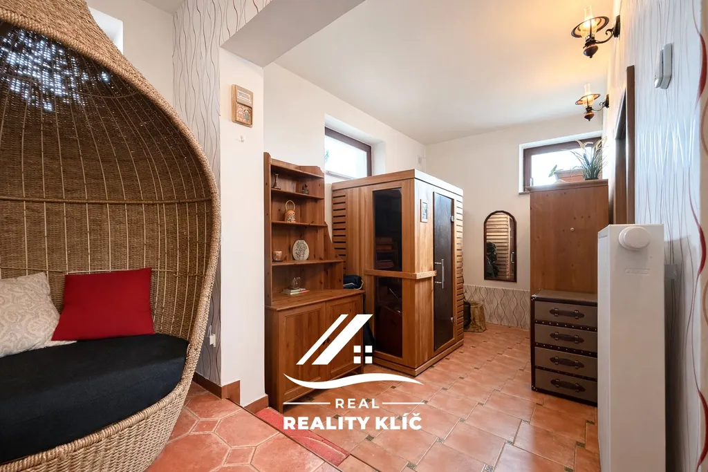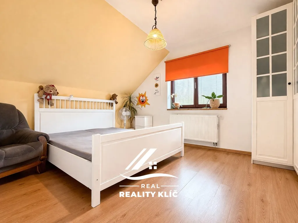 Horní patro o ploše 145 m² je koncipováno jako klidová zóna s maximálním soukromím pro všechny členy rodiny. Nacházejí se zde tři ložnice o výměrách 31,2 m², 16,2 m² a 14,5 m². Unikátním prvkem podkroví je další rozlehlá místnost o ploše 33,4 m², která může slouží jako posilovna, nabízí široké možnosti dalšího využití jako herna nebo master bedroom. Patro dále disponuje druhou koupelnou s WC a balkonem o výměře 10,4 m². Pro dokonalou relaxaci je v domě k dispozici také vlastní sauna. Nad celým tímto podlažím se navíc nachází půdní prostor, který slouží jako praktické a objemné úložiště.