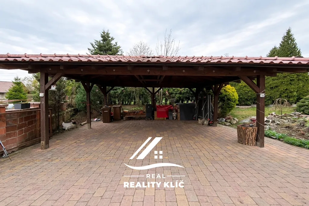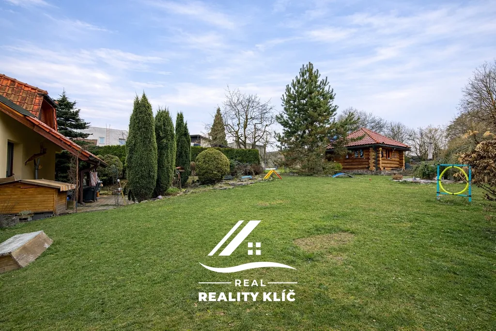 K domu náleží pečlivě udržovaná zahrada o rozloze 1 003 m², která je díky vzrostlé zeleni skutečnou oázou klidu. Bazén a zahradní chaloupka nejsou součástí prodeje nemovitosti a tato část bude oplocena. Exteriér doplňuje okrasná skalka s vodní fontánkou a bylinkový kout, přičemž rozlehlá travnatá plocha nabízí prostor pro další aktivity. Kromě garáže je na pozemku zajištěno také zastřešené parkovací stání, které pohodlně pojme další dva až tři automobily.