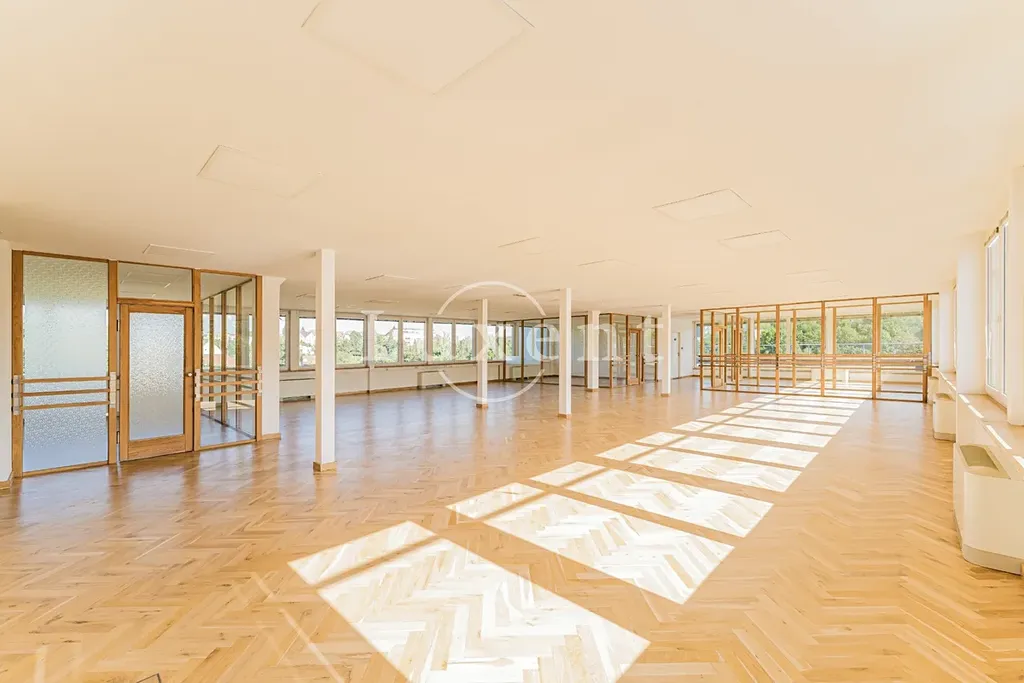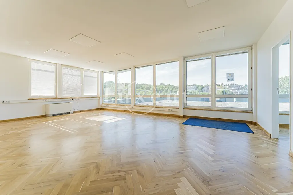 Kancelář se nachází v 5NP budovy s krásným výhledem do okolí, má terasu. Prostor skládá se z hlavního otevřeného prostoru 4 menších kanceláří oddělených skleněnými příčkami.