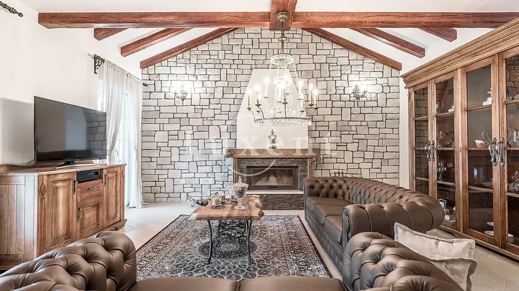 Vila o celkové obytné ploše 180 m2 je rozložena do dvou podlaží a nabízí velkorysý obytný prostor s otevřeným konceptem – prostorný obývací pokoj s krbem plynule navazuje na jídelní kout a plně vybavenou kuchyni. K dispozici jsou tři elegantní ložnice, každá s vlastní koupelnou. Hlavní ložnice disponuje navíc saunou a masážní vanou, což zajišťuje maximální komfort a relaxaci. V přízemí se dále nachází samostatná toaleta pro hosty.