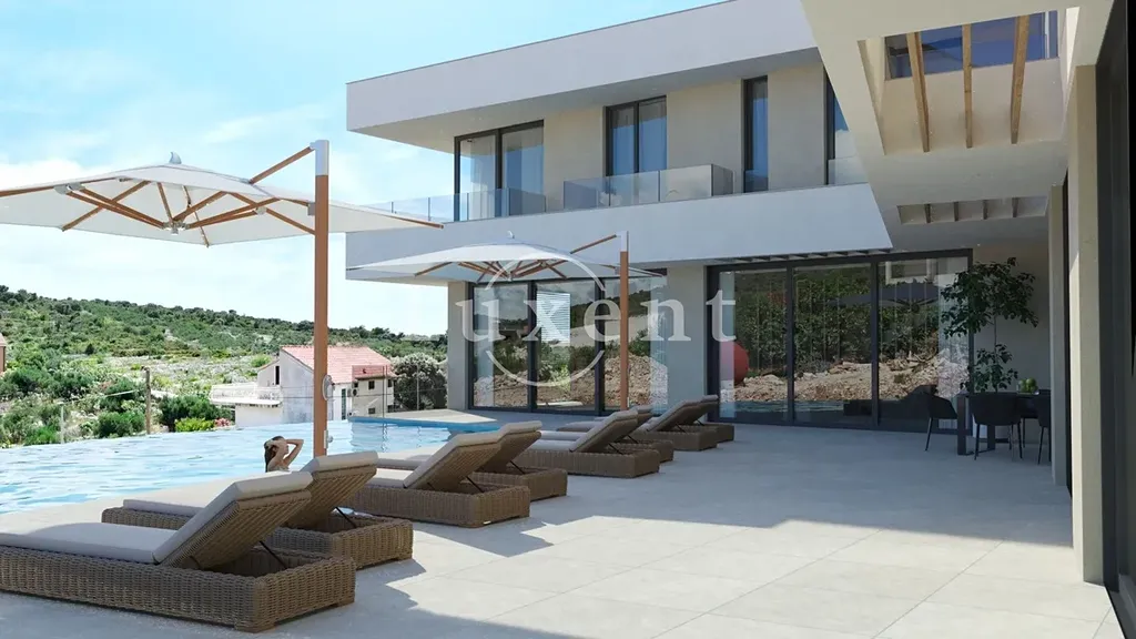 Exteriér vily nabízí výjimečné zázemí pro letní životní styl – prostorný bazén o velikosti 68,94 m² s plochou pro slunění, letní kuchyni a rozsáhlé terasy, které tvoří ideální prostředí pro rodinné oslavy i neformální setkání s přáteli. Celková kompozice domu zajišťuje dostatek soukromí, vysoký komfort a přímý kontakt s přírodou a mořem.
