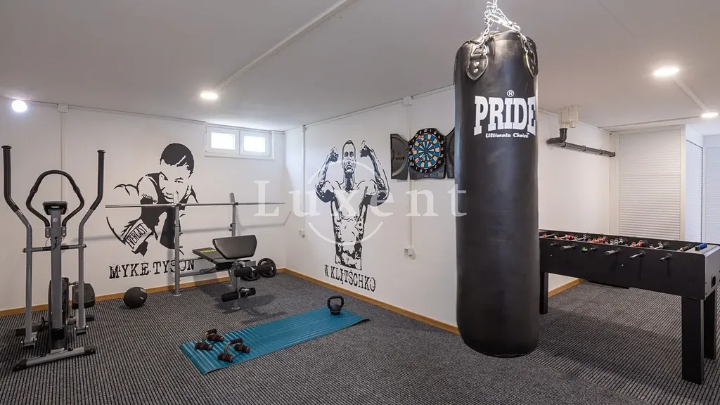 Vila se rozkládá na dvou podlažích a suterénu, kde se nachází menší domácí posilovna, herna a technická místnost s bazénovou technologií, která přispívá k pohodlí i funkčnosti domu.