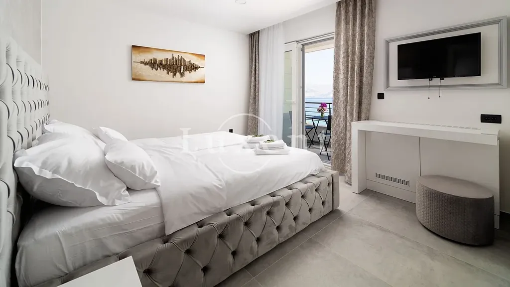 V suterénu se nachází místnost určená pro volnočasové aktivity, prostorná tělocvična a elegantní koupelna. Přízemí domu tvoří světlý, moderně zařízený obývací pokoj propojený s kuchyňským koutem, jedna ložnice, další koupelna a tři terasy – z toho dvě částečně kryté, ideální pro klidné chvíle i letní večery s přáteli. V prvním patře se nachází čtyři ložnice s vlastními koupelnami a dva balkony, které nabízejí panoramatické výhledy na moře a okolní pobřeží.