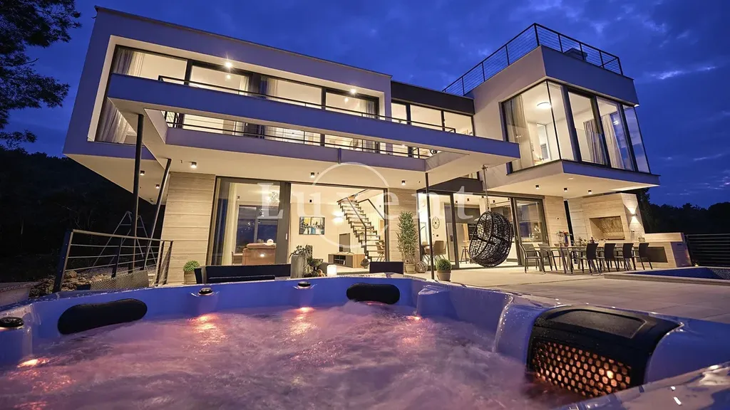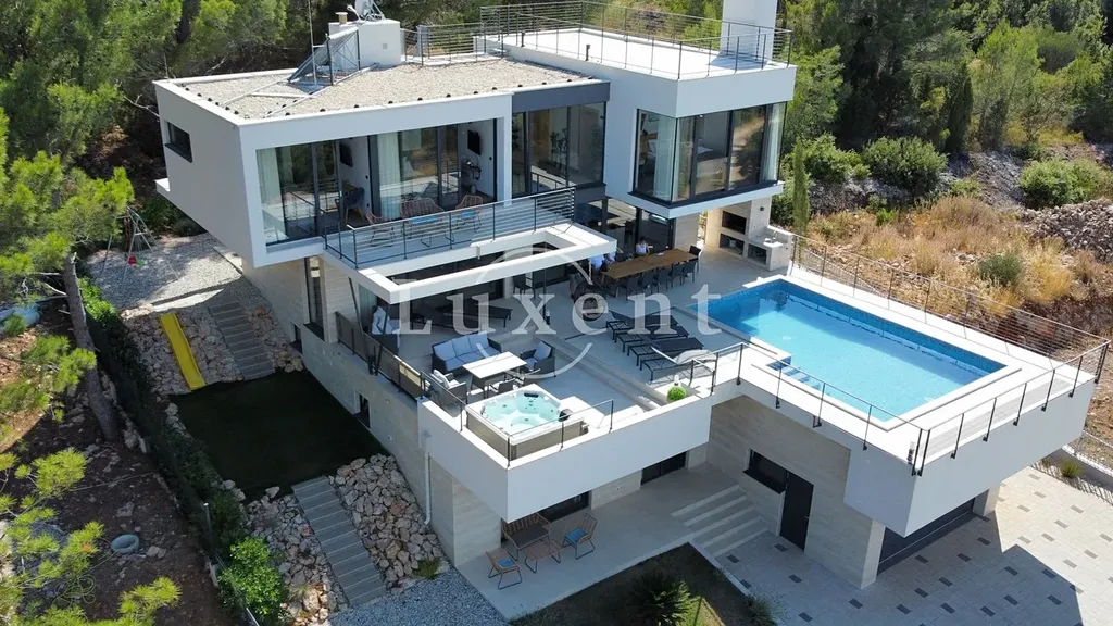 Nabízíme k prodeji nádhernou moderní vilu 400 m2, která se nachází v tichém prostředí s nerušeným výhledem na moře. Tato jedinečná rezidence, postavená na pozemku o rozloze 773 m2, se rozkládá na třech komfortních podlažích a nabízí elegantní kombinaci nadčasového designu, vysoce kvalitního vybavení a absolutního soukromí.