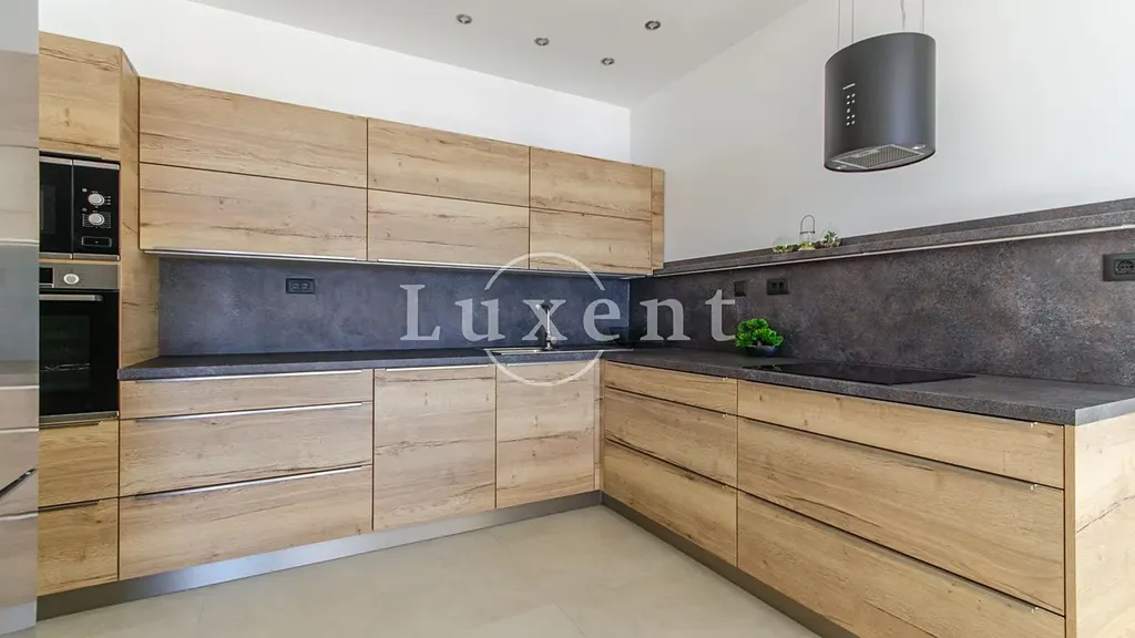 Vila byla dokončena v roce 2022 a nabízí promyšlené dispoziční řešení rozložené do dvou podlaží. Přízemí zahrnuje jednu ložnici s vlastní koupelnou, samostatnou toaletu pro hosty, komoru, technickou místnost a prostorný obytný prostor propojený s kuchyní a jídelnou. Odtud je přímý vstup na terasu s přelivovým a vyhřívaným bazénem, ideálním pro relaxaci s výhledem na moře.