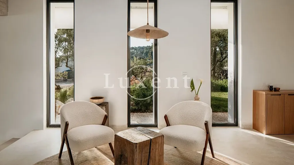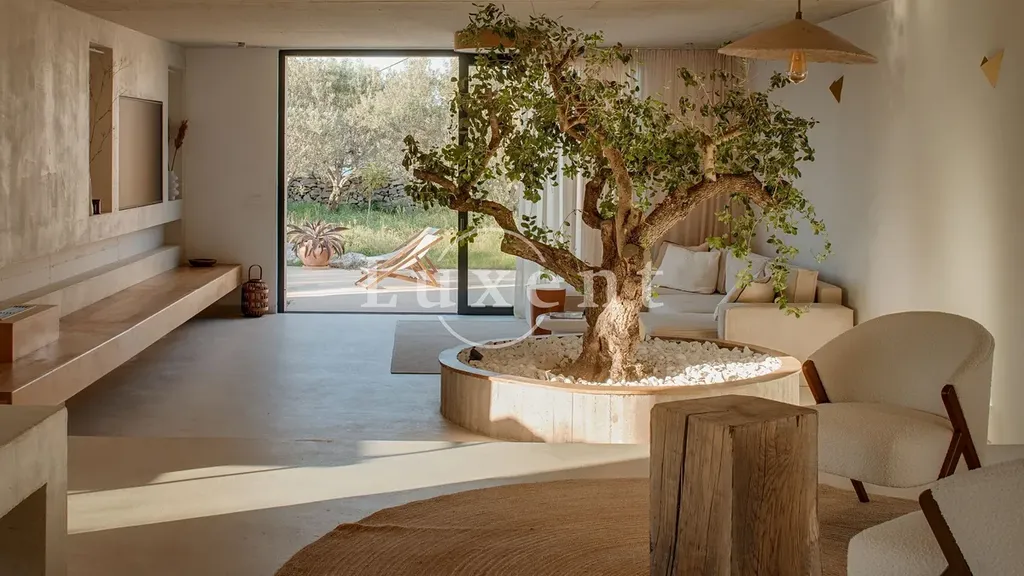 Hned při vstupu do vily vás přivítá prostorný a světlem zalitý obývací pokoj, jehož dominantou je velký olivovník zakomponovaný přímo do interiéru, který dotváří neopakovatelnou atmosféru klidu a propojení s přírodou. Díky velkým proskleným plochám je v celém prostoru dostatek přirozeného světla a zároveň ničím nerušený výhled na azurové moře.