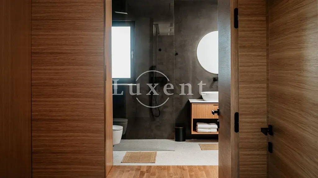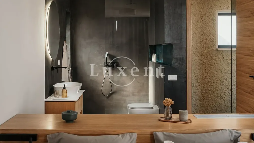 V prvním patře vily se nacházejí tři komfortní ložnice, pracovna, šatna, tři moderně vybavené koupelny a prostorná terasa s vířivkou, ze které se otevírá nádherný výhled na moře a okolní přírodu. Součástí venkovního prostoru je i wellness zóna se saunou, která přispívá k dokonalému odpočinku a soukromému luxusnímu zážitku.
