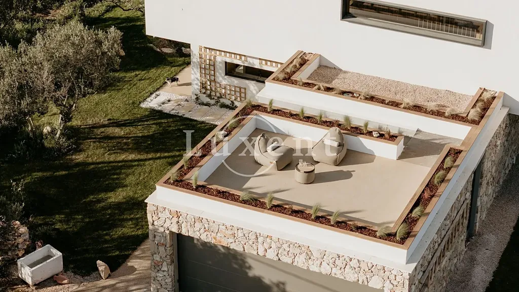 Zahradu vily zdobí pečlivě upravené středomořské rostliny a olivovníky, které vytvářejí autentickou atmosféru dalmatského života a zajišťují maximální soukromí. Výhled na křišťálově čisté moře, tiché prostředí a dechberoucí západy slunce dotvářejí jedinečný dojem z této nemovitosti.