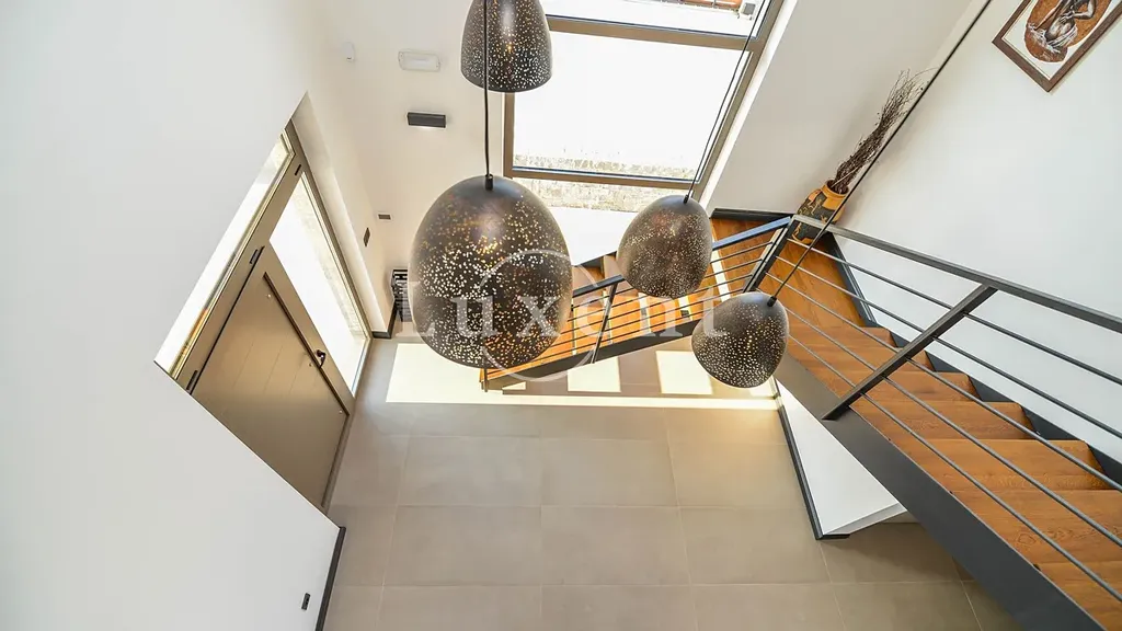 Hlavní obytnou část tvoří elegantní vila s prostorným interiérem, ve kterém se nacházejí tři ložnice, pět koupelen, moderně vybavená posilovna, relaxační sauna a vířivka. Centrem exteriéru je soukromý bazén obklopený sluneční terasou a venkovním krbem – ideální prostor pro odpočinek i společenské chvíle.