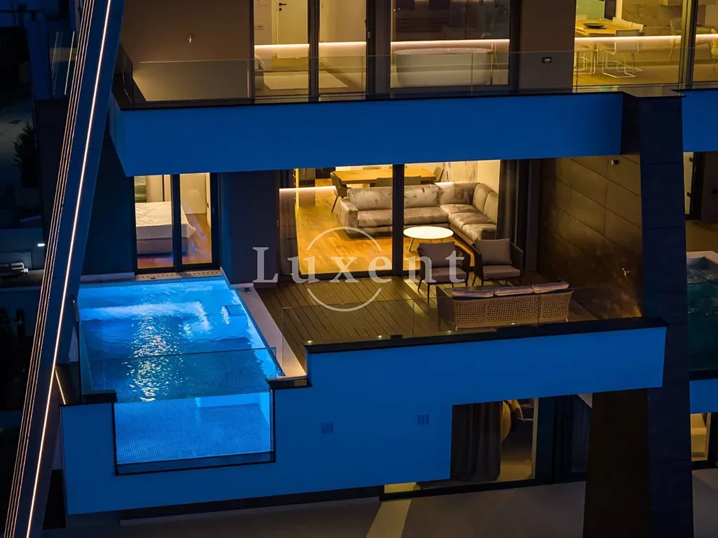 Apartmán o velkosti 144 m2 zahrnuje tři ložnice, otevřený obytný prostor s krbem, kuchyni a jídelnu, dvě koupelny, šatny, a vlastní wellness zónu. Dominantou je prostorná, slunná krytá terasa s bazénem, odkud se otevírá nádherný výhled na moře. Z této soukromé terasy vede přímý vstup na tichou, čistou oblázkovou pláž, která je vybavena venkovní toaletou, sprchou a pozvolným vstupem do moře.