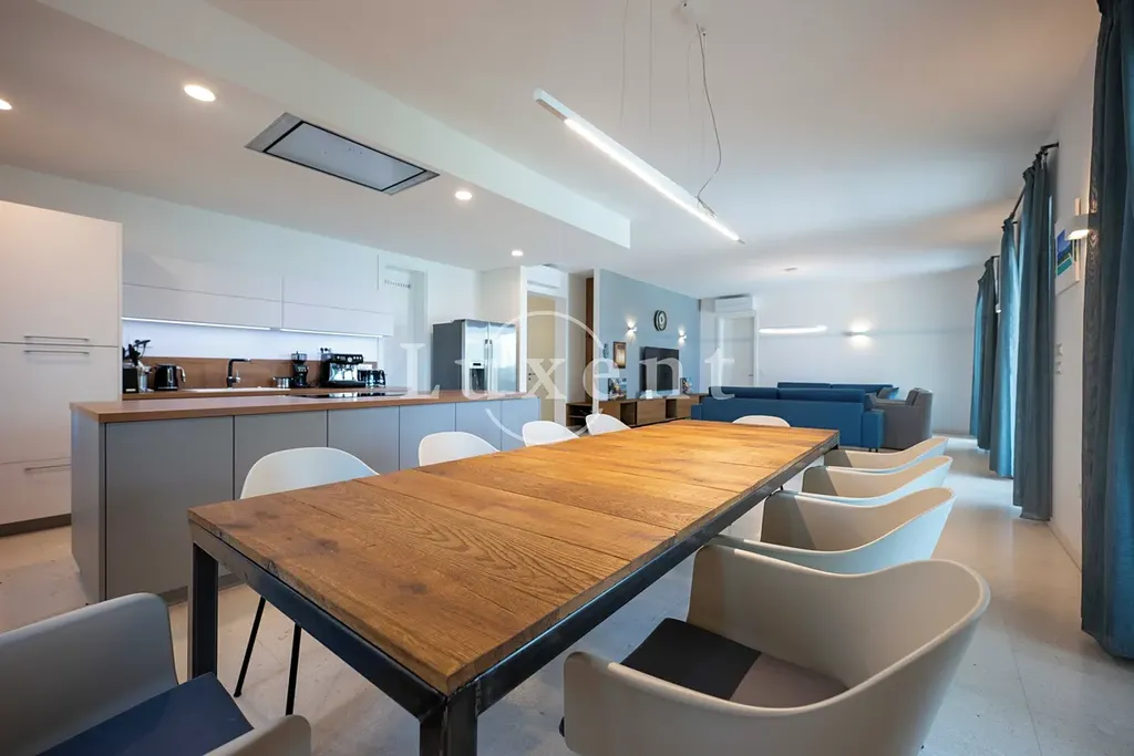 Interiér je promyšlen do posledního detailu a díky vysokým stropům a velkoformátovým oknům působí mimořádně vzdušně a svěže. V přízemí se nachází prostorný obývací pokoj propojený s kuchyní a jídelnou, dvě ložnice s koupelnou a technické zázemí. Skleněné dveře vedou přímo na dvůr s bazénem, venkovní sprchou a toaletou. Venkovní plochy jsou obloženy luxusním bračským kamenem, který podtrhuje středomořský charakter nemovitosti. V patře se nacházejí tři ložnice, každá s vlastní koupelnou či šatnou, a také pracovna, kterou lze snadno přizpůsobit dle potřeb. Z velkého balkonu se otevírá působivý panoramatický výhled na moře a okolní ostrovy.