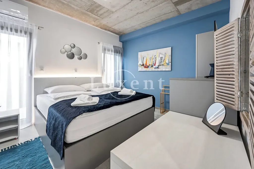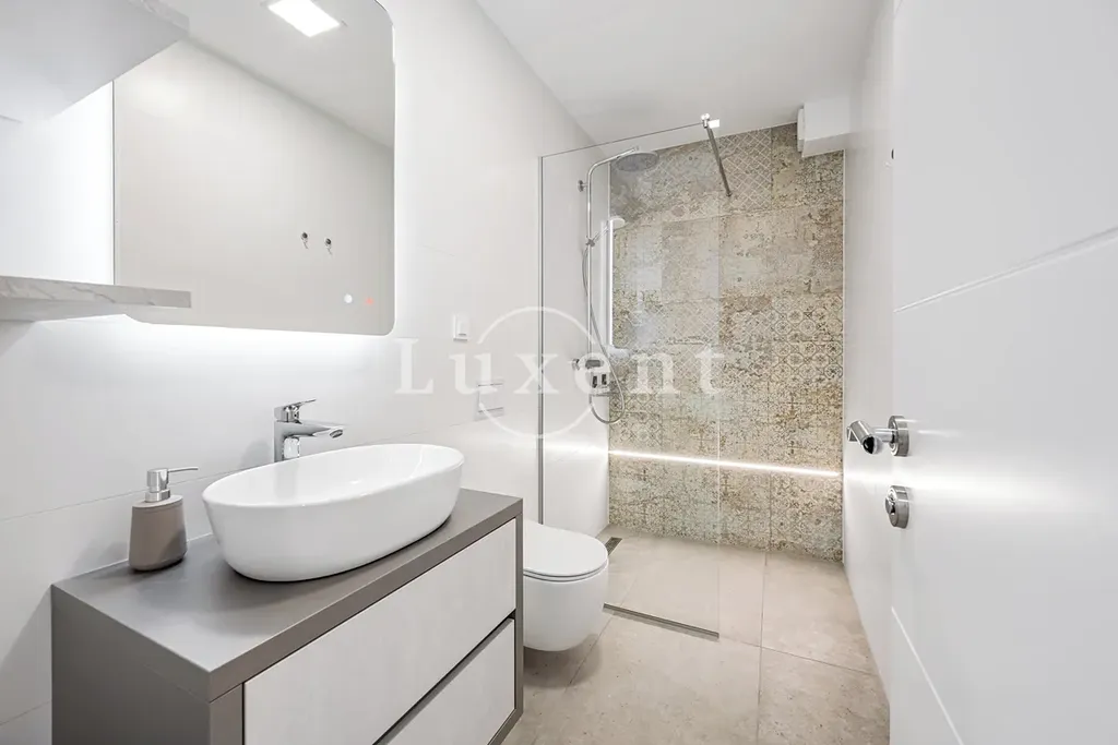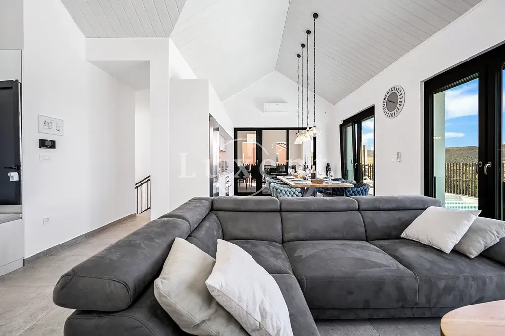 Vila se rozkládá na pozemku o velikosti 581 m2 a nabízí obytnou plochu 316 m2 rozvrženou do dvou podlaží. V přízemí se nachází čtyři prostorné ložnice, každá s vlastní koupelnou, dále obývací prostor s kuchyní, samostatná koupelna, wellness a sauna. V horním patře se nachází další obývací zóna, kuchyně s jídelnou, toaleta a prádelna. Tato výjimečná nemovitost z roku 2022 spojuje špičkový design, vysoký komfort a mimořádné umístění s otevřeným výhledem na moře, který je umocněn kaskádovitou polohou domu.