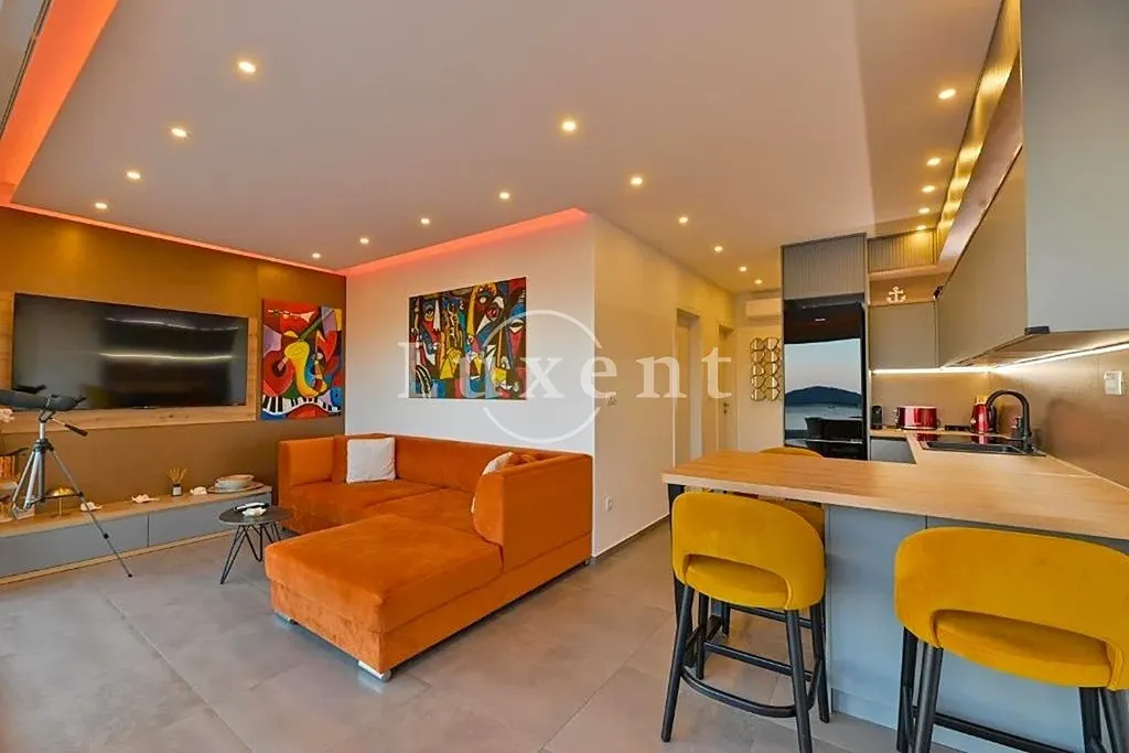 Byt orientovaný na jihozápad je zalitý denním světlem po celý rok. Na ploše 61 m2 se nachází otevřený obývací prostor s kuchyní a jídelnou, dvě elegantní ložnice, dvě moderní koupelny a chodba. Díky velkému prosklení se interiér přirozeně propojuje s lodžií a nabízí ničím nerušený výhled na moře.
