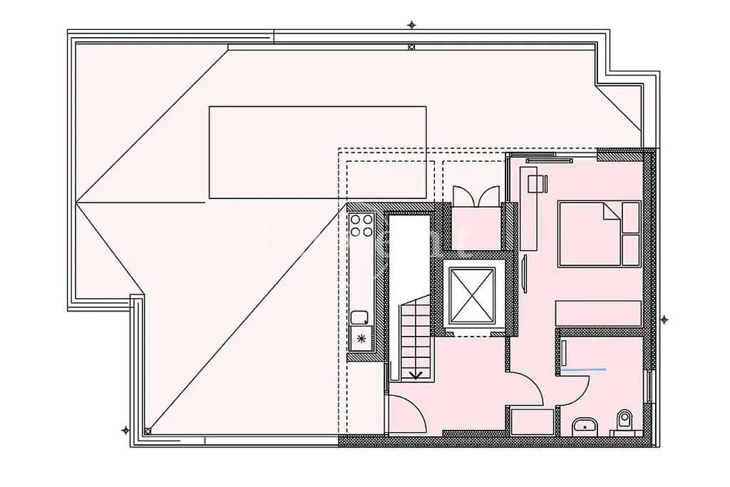 Byt má západní orientaci a zabírá první patro a podkroví budovy. K dispozici jsou také garážová parkovací stání v suterénu domu. Apartmán je vybaven moderními technologiemi a stylovým interiérem. Budova disponuje vlastním bazénem a sluneční terasou. Byt je vybaven klimatizací a podlahovým vytápěním, což zajišťuje komfortní pobyt po celý rok. Cena apartmánu nezahrnuje garážové stání.