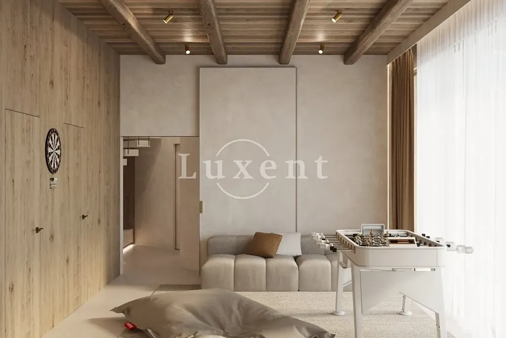 Exteriér doplňuje venkovní nekonečný bazén s masážními tryskami, dětské hřiště a malý fotbalový kurt, což vytváří ideální prostředí pro relaxaci i sportovní aktivity.