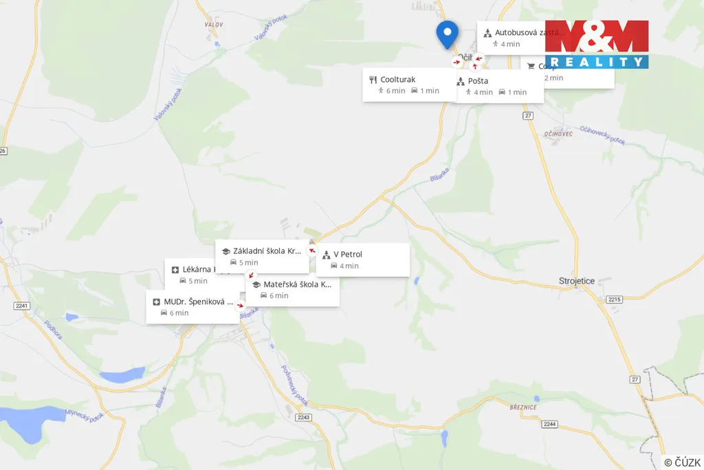 V pěší vzdálenosti od domu se nachází obchod, autobusová zastávka a pošta. Kompletní občanská vybavenost je k dispozici ve městě Kryry, vzdáleném pouhých 5 minut jízdy autem.