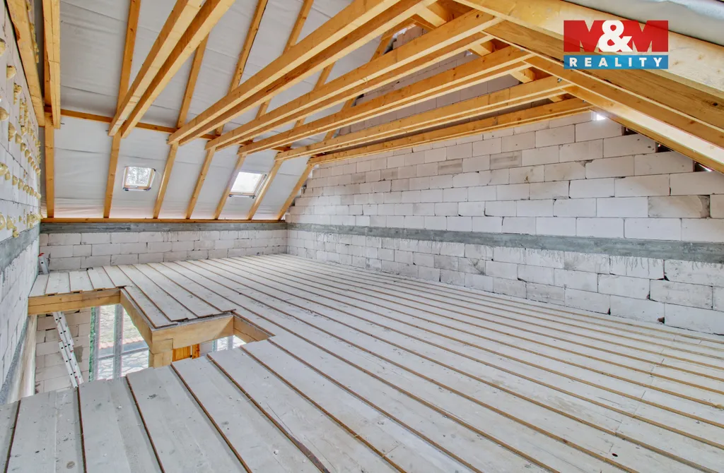 Stav: Rozestavěno (betonové podlahy, bez omítek, dřevěné trámové stropy).
